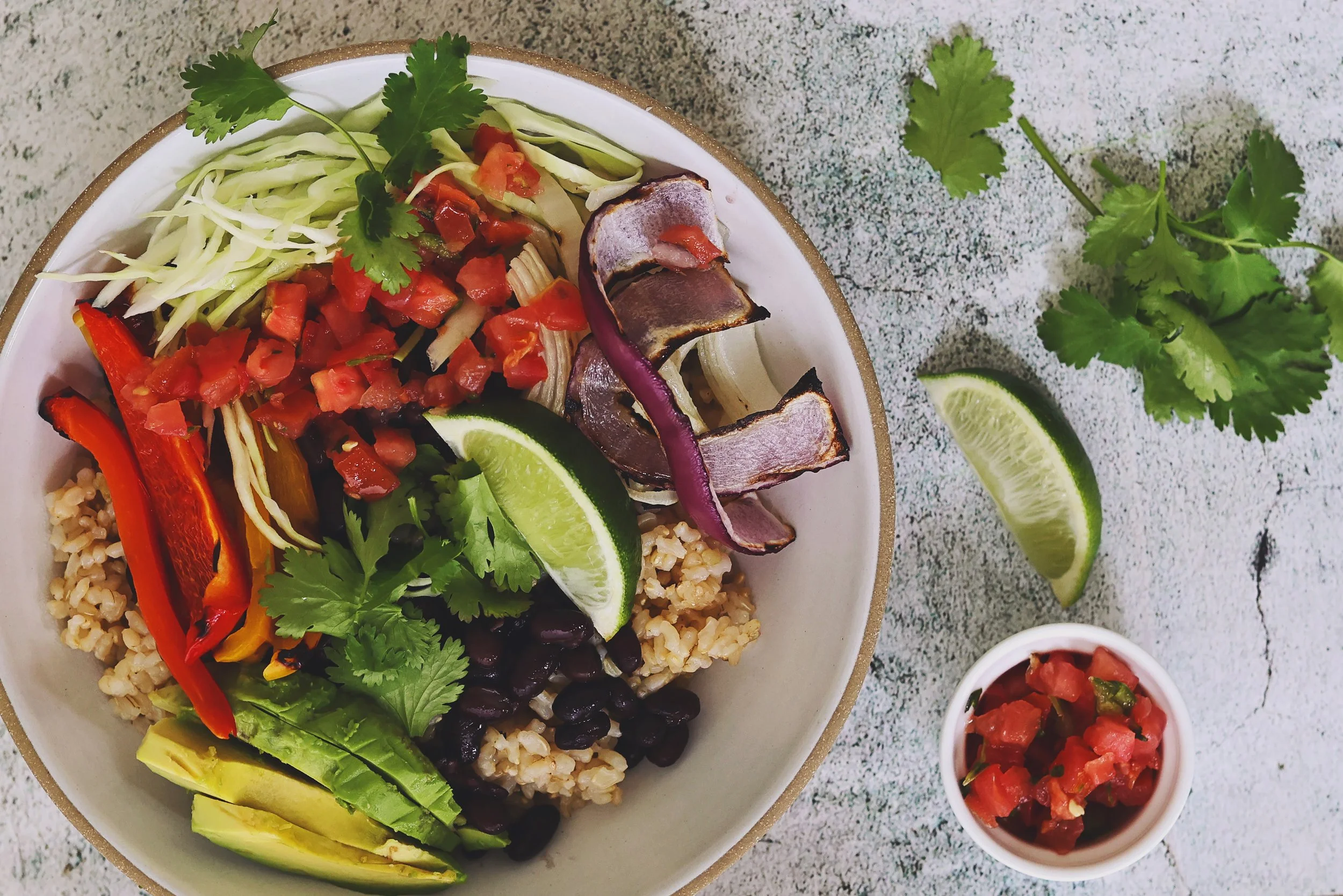 Add grilled red onion, grilled bell pepper, avocado, shredded cabbage, pico de gallo, lime, cilantro…etc!